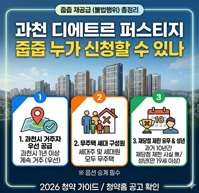 과천 디에트르 줍줍 누가 신청할 수 있나를 궁금해하는 분들이 많습니다. 최근 무순위 청약, 이른바 줍줍에 대한 관심이 커지면서 과천 디에트르 퍼스티지처럼 시세 차익 기대감이 큰 단지는 더욱 빠르게 검색되고 있습니다. 하지만 과천 디에트르 줍줍 누가 신청할 수 있나를 제대로 확인하지 않고 접수부터 서두르면, 뒤늦게 자격이 맞지 않아 부적격 처리되는 일이 생길 수 있습니다. 이번 재공급은 아무나 넣을 수 있는 방식이 아니라, 모집공고일 기준 자격을 충족하는 사람만 신청할 수 있도록 제한됐다는 점이 핵심입니다.