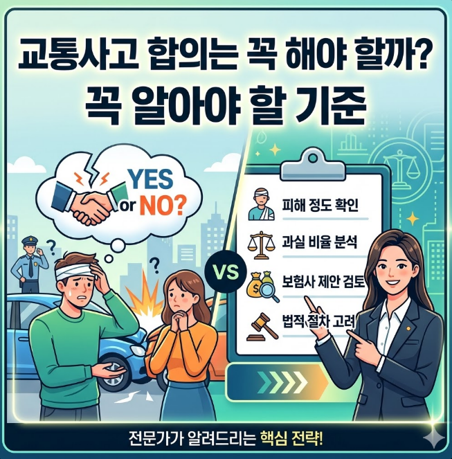 교통사고가 발생하면 많은 분들이 가장 먼저 떠올리는 질문이 있습니다. 바로 교통사고 합의는 꼭 해야 할까?라는 고민입니다. 사고 직후에는 몸 상태를 확인하는 것도 중요하지만, 시간이 조금 지나면 보험사 연락이 오고, 합의 이야기가 나오기 시작합니다. 이때 적지 않은 분들이 교통사고 합의는 꼭 해야 할까?라는 생각을 하게 됩니다. 무조건 합의를 해야 사건이 끝나는 것인지, 합의를 하지 않으면 불이익이 생기는 것인지, 그냥 보험 처리만으로 마무리할 수는 없는지 궁금해하는 경우가 많습니다.