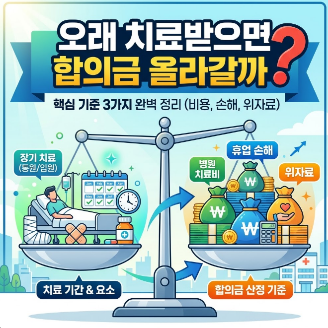 이번 글에서는 **병원 치료를 오래 받으면 합의금이 올라갈까?**라는 궁금증을 중심으로, 치료 기간과 합의금의 관계, 보험사가 중요하게 보는 기준, 피해자가 놓치지 말아야 할 대응 방법까지 차근차근 정리해보겠습니다.