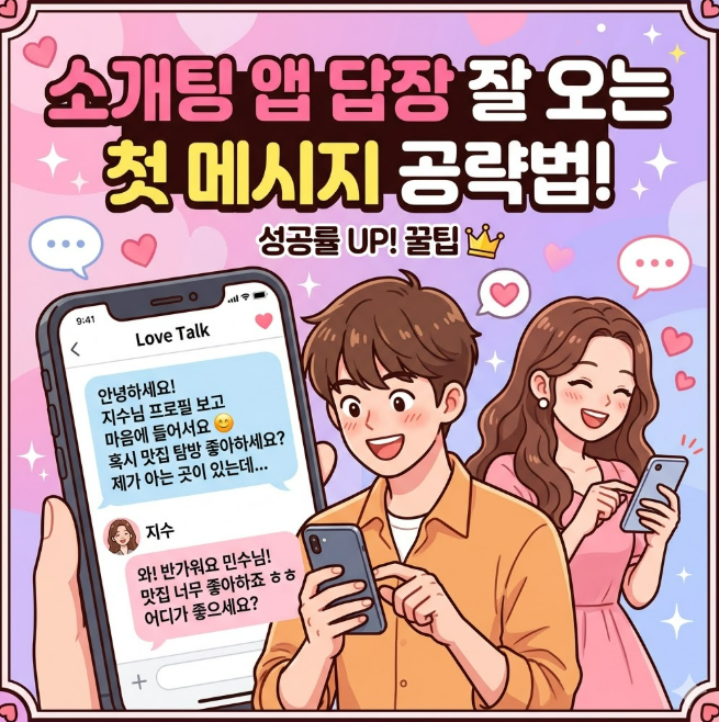 소개팅 앱에서 대화가 늘 금방 끊겼다면, 이번에는 첫 메시지부터 조금 다르게 접근해보시기 바랍니다. 소개팅 앱 첫 메시지 추천은 결국 상대를 사로잡는 기술이 아니라, 자연스럽게 말을 이어가게 만드는 기술입니다. 그리고 그 차이가 실제 답장률을 꽤 크게 바꿉니다.