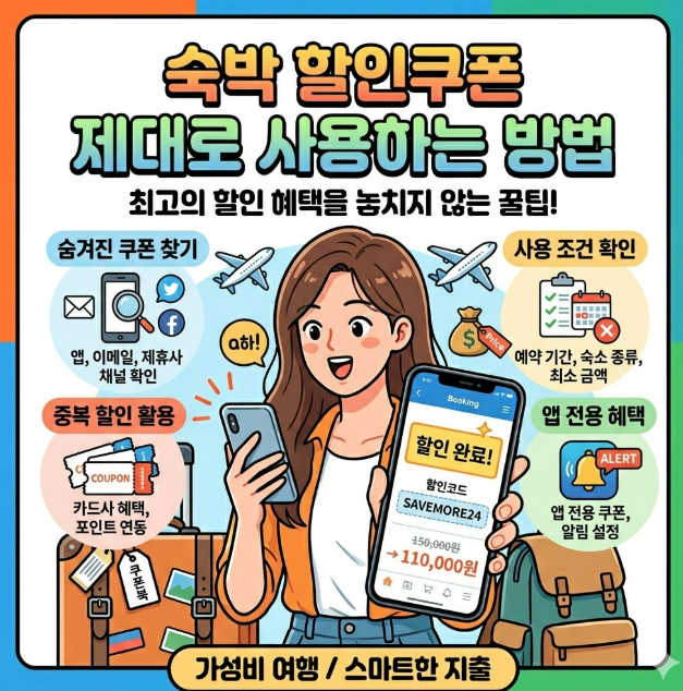 정리하자면 숙박 할인쿠폰 제대로 사용하는 방법은 생각보다 단순합니다. 먼저 쿠폰 조건을 꼼꼼히 확인하고, 할인율보다 최종 결제 금액을 비교하고, 숙소 가격대에 맞는 쿠폰을 고르고, 중복 적용 여부와 환불 규정을 함께 살피면 됩니다. 이 기본만 지켜도 숙박비를 훨씬 효율적으로 줄일 수 있습니다.
